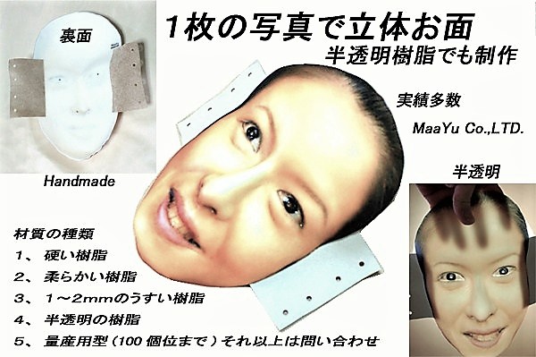 2、製作材質が選べます。(硬いお面、柔らかいお面、超薄型お面、半透明お面、小型お面、大型お面等。